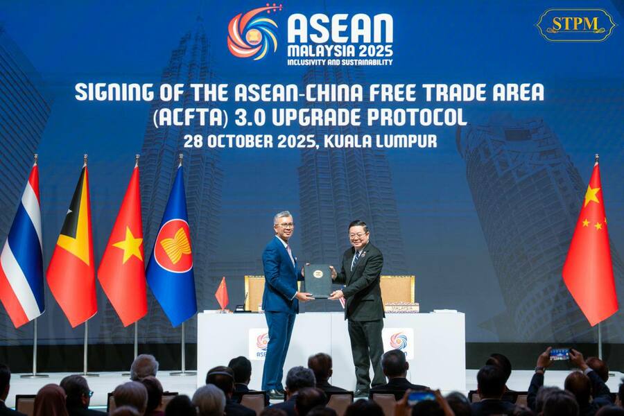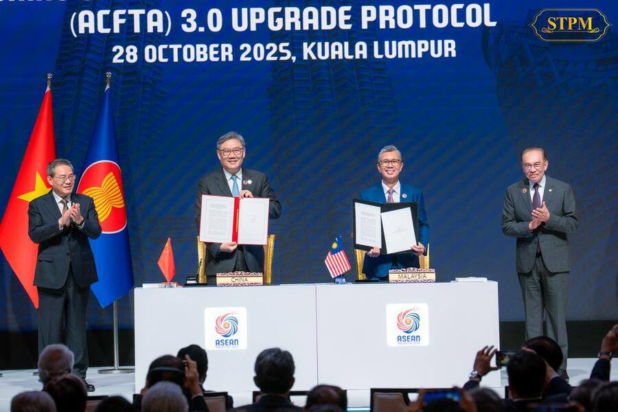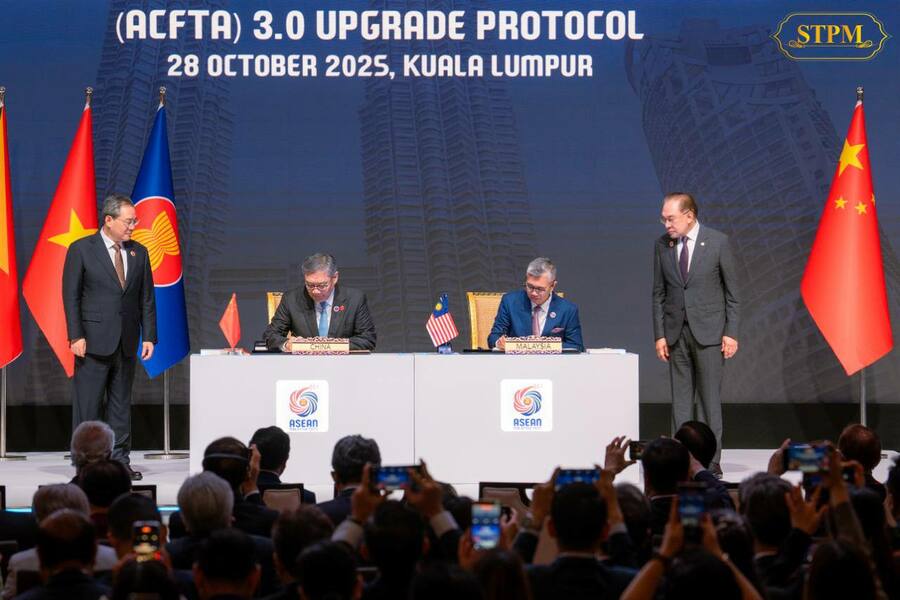 សម្តេចមហាបវរធិបតី ហ៊ុន ម៉ាណែត នាយករដ្ឋមន្ត្រី នៃព្រះរាជាណាចក្រកម្ពុជា រួមជាមួយប្រមុខរាជ/រដ្ឋាភិបាលអាស៊ាន និងឯកឧត្តម លី ឈាង នាយករដ្ឋមន្ត្រី នៃសាធារណរដ្ឋប្រជាមានិតចិន អញ្ជើញចូលរួមពិធីចុះហត្ថលេខា លើការដំឡើងកម្រិតតំបន់ពាណិជ្ជសេរី អាស៊ាន-ចិន ៣.0 នាព្រឹកថ្ងៃទី២៨ ខែតុលា ឆ្នាំ២០២៥ នៅរដ្ឋធានីគូឡាឡាំពួ ប្រទេសម៉ាឡេស៊ី។ រូបថត៖ ទំព័រហ្វេសប៊ុកសម្តេចធិបតី
